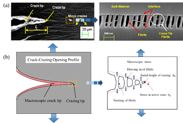 基于线弹性断裂假设的应变能耗散较小,即使完全转化为热能仍然无法描述观察到的剧烈升温现象。大量研究表明,非晶态脆性PMMA材料的宏观裂纹是由微观韧性银纹演化产生,银纹由微纤和50-80%的孔洞组成(图3-a)。银纹演化可分为萌生、生长、断裂三个阶段(图3-b)。通过宏观本构的银纹萌生准则作为连接宏观裂纹与微观银纹的桥梁,得到银纹激活(萌生)应力,激活应力拉拽银纹微纤生长,最终获得银纹到达流动断裂状态的应力应变和能量耗散。