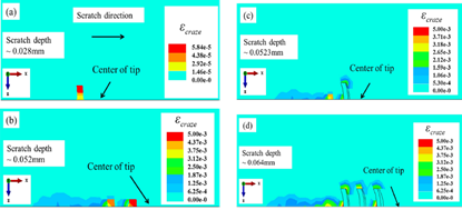 图2 不同刮擦深度材料银纹破坏: a) 0.028 mm, b) 0.052 mm, c) 0.0523 mm, d) 0.064 mm. [2]