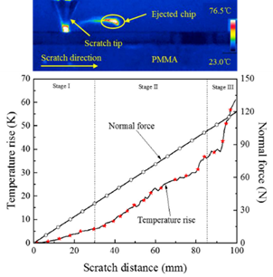 在非晶态高分子材料PMMA刮擦实验中,蒋晗教授课题组研究人员利用高速红外测温仪观察到与划痕密切相关的温升现象[1],尤其是材料表面裂纹破坏阶段伴随着剧烈的温升(图1)。
